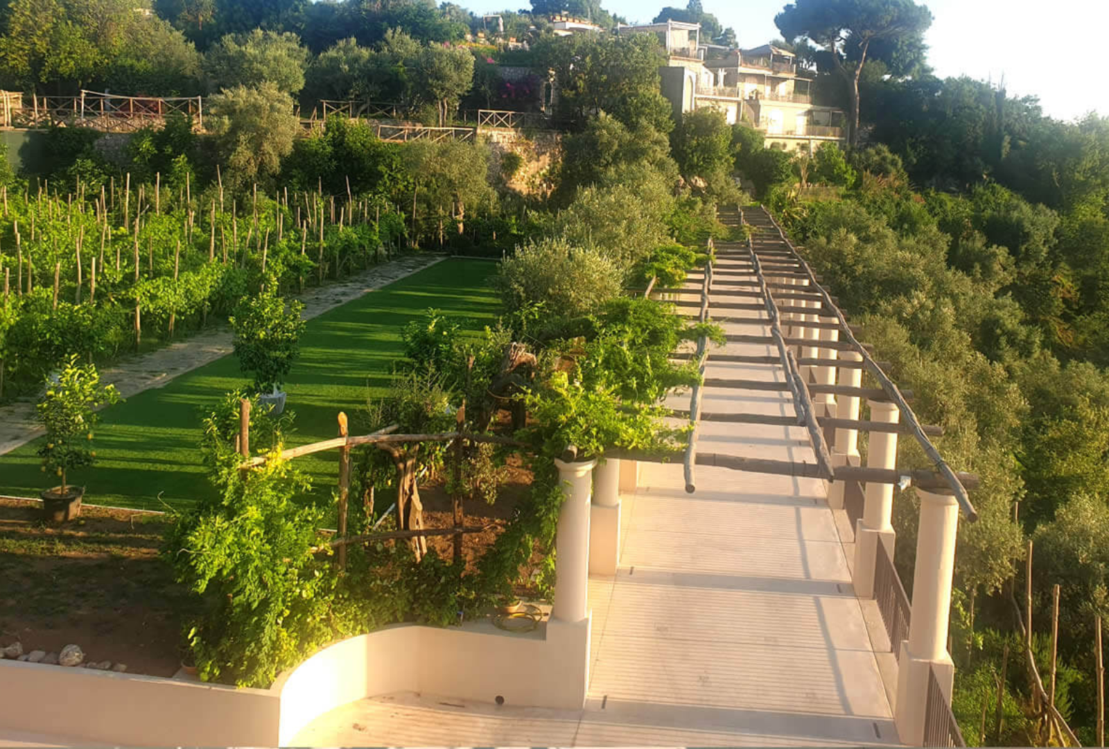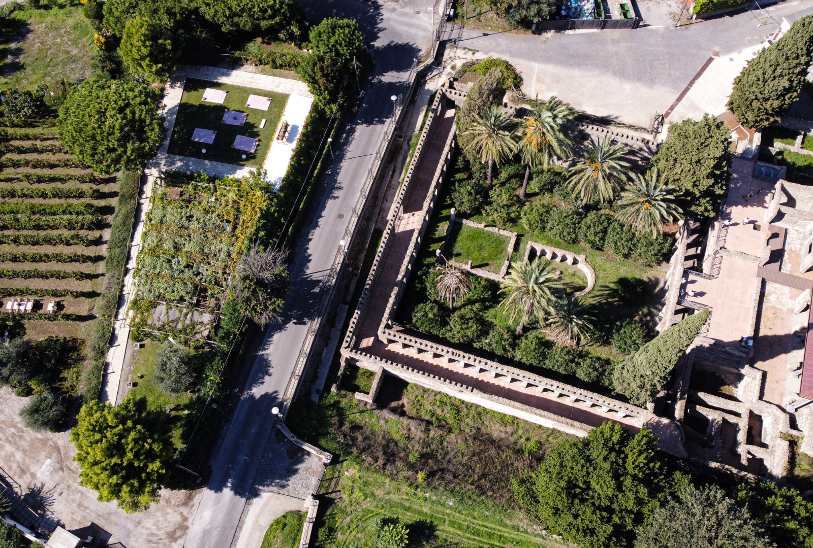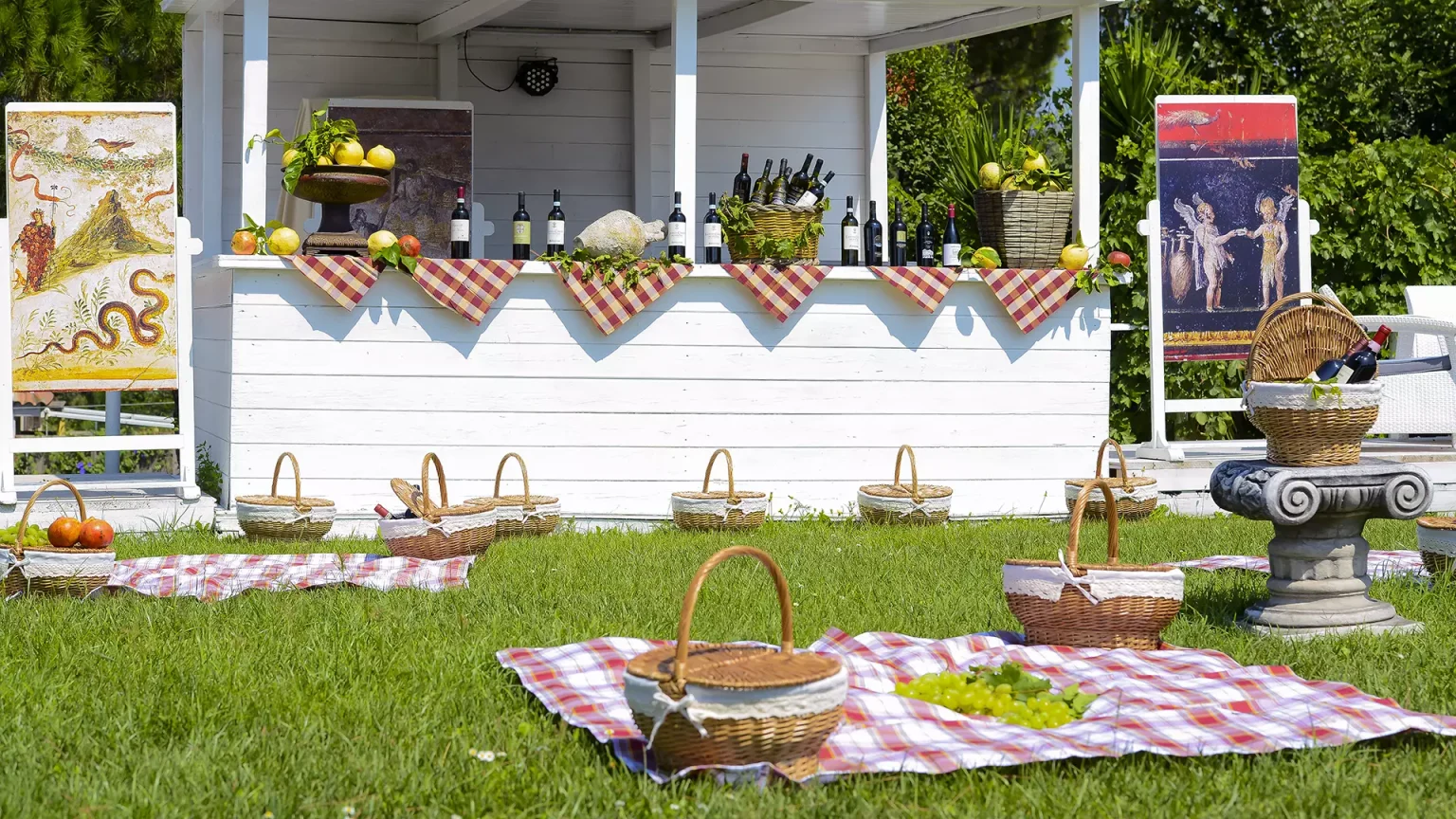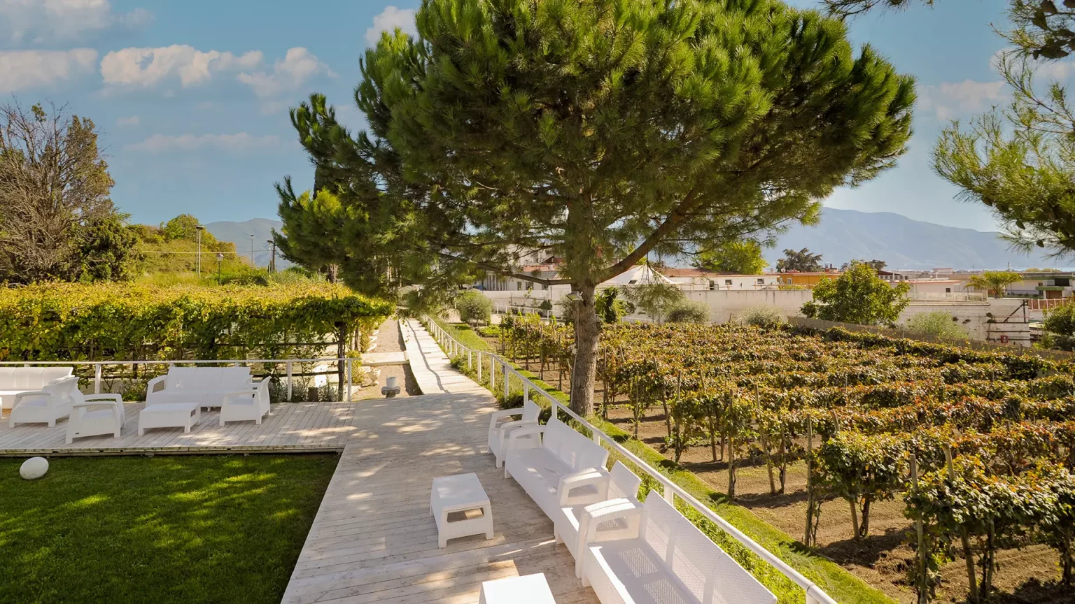 Il Giardino dei Sensi è uno spazio all'aperto composto da pergolato, prato e vigneto. Si sviluppa lungo il viale del parco archeologico di Pompei, prospiciente all‘antica dimora Villa di Diomede e con incantevole affaccio su essa. A soli 3 minuti a piedi dall'uscita di Villa dei Misteri.